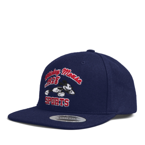 Chiếc nón snapback này mang phong cách cổ điển với tông màu xanh navy / đen tạo cảm giác khỏe khoắn và dễ phối đồ. Điểm nhấn đặc biệt nằm ở phần thêu hình Mickey Mouse phong cách thể thao, kèm theo dòng chữ “Mickey Mouse 1928 SPORTS” nổi bật với sắc đỏ và trắng.